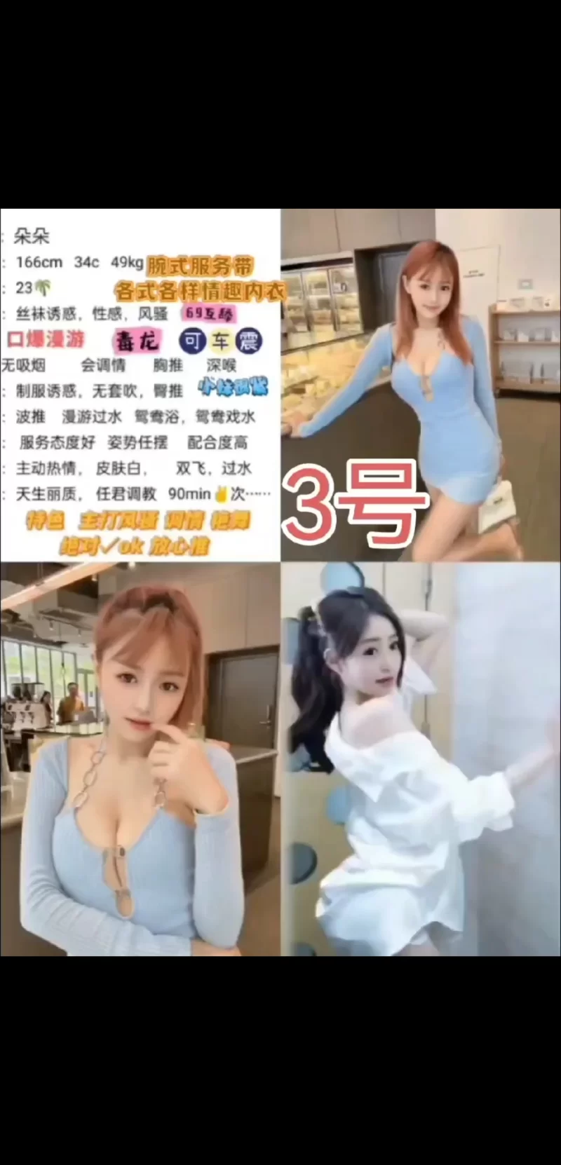 一进门看到妹妹小弟弟马上硬起来抱住她,然后她帮洗了一个鸳鸯澡,放点油全身单调情。帮用嘴舔一下弟弟然后再用她两个大大胸夹住弟弟推上推下,忍不住几分钟就射,然后休息一会。和妹妹聊一会天,再看一下视频,然后妹妹,帮我调情口硬弟弟,我也舔一下妹妹的水蜜桃,小弟弟硬了然后慢慢插进去,妹妹的叫床声很好听,又销魂还一直叫。哥哥,用力呀,在用力掐进去点,听到这声音实在受不了,就操了20几分钟射了,很爽有点累,妹妹帮按了全身,然后摸来摸去弟弟又开始硬了又忍不住第三次进攻弄了半个小时多才射了,就去洗个澡,洗出来妹妹又帮做个全身按摩刚好到两个小时就走了,妹妹还亲自送到门口,出差回来下次还来,真的爽漂亮又年轻,胸又大苗条身材,要是想加她微信别忘了备注狼友介绍,推荐给你们这一些狼友对了加她的时候记得备注朋友介绍应该可以优惠一点哈哈